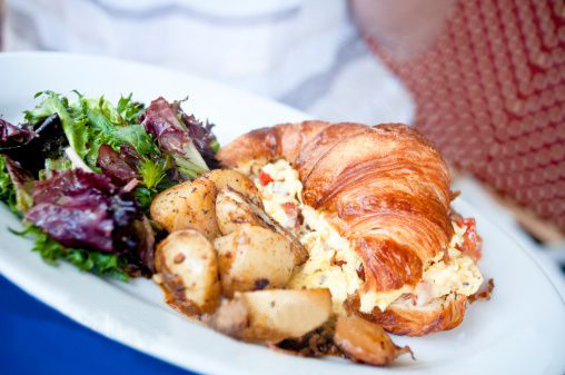 A simple, elegant luncheon with organic chicken breast on a croissant